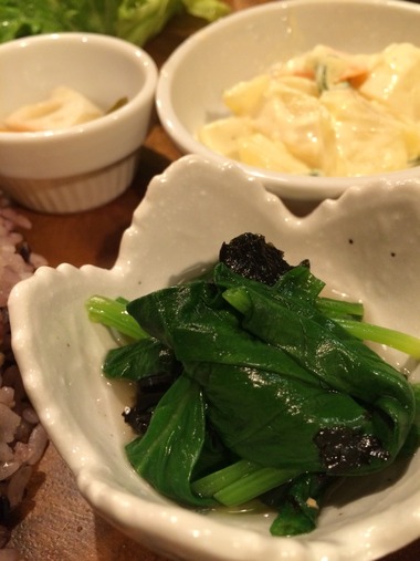 小鉢。この日はホクホクとしたポテサラに、ピクルス、おひたし。