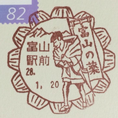 富山の薬売り、立山連峰、鱒寿司の形の変形印。薬売りが高倉健みたいに渋くて憂いを帯びていてカッコいいです。