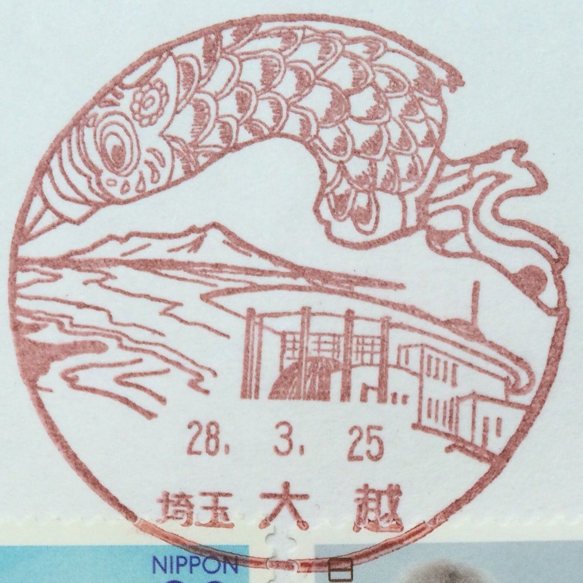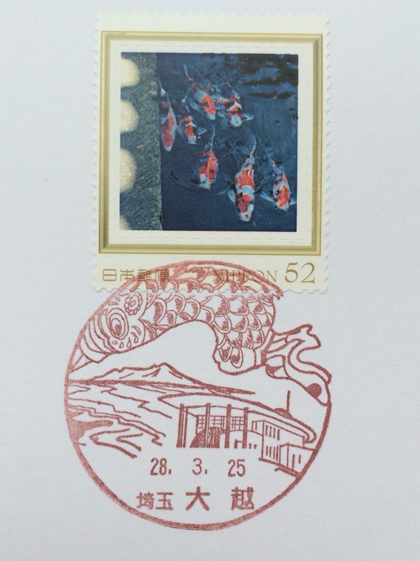 プロ野球開幕(3月25日)にちなんで、カープファン仲間で風景印好きさんから、なんと、ジャンボ鯉のぼりの風景印が届きました!示し合わせたわけでもないのに、風景印かぶり!(笑)