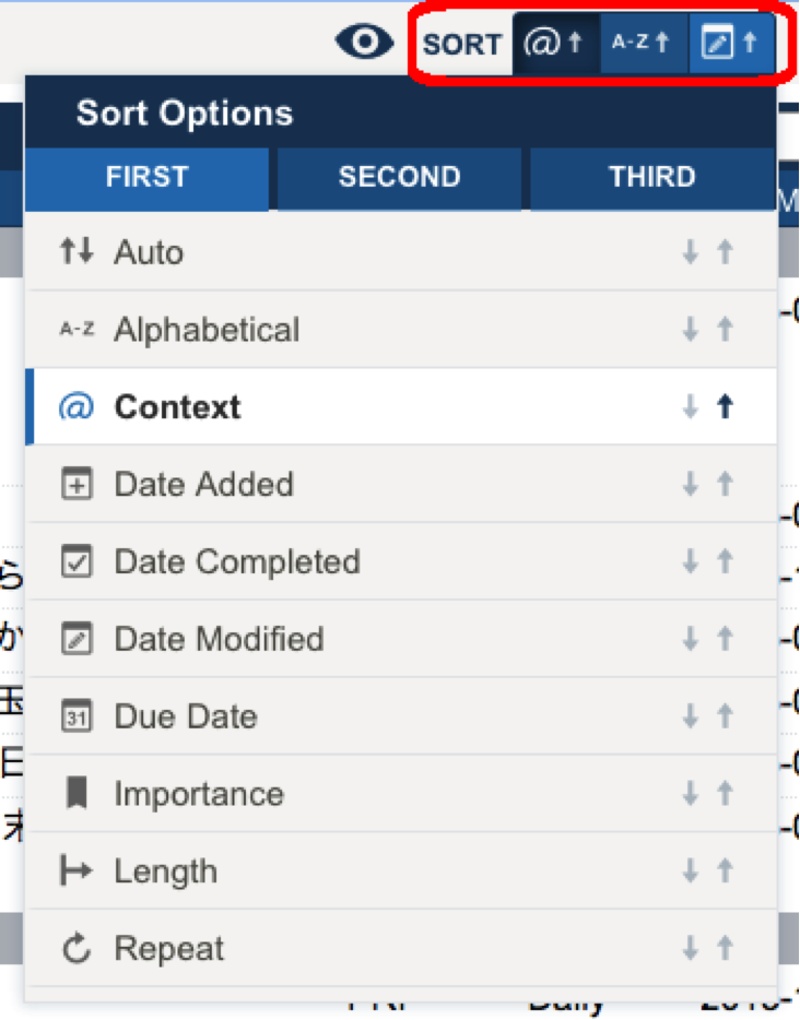 ソートは、第1順位(FIRST)、第2順位(SECOND)第3順位(THIRD)まで設定することができます。私は第1順位「Context」昇順↑、第2順位「Alphabetical」昇順↑、第3順位「Due Date」昇順↑に設定しています。