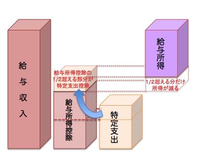 まず、控除額の計算方法の改正ですが、特定支出が給与所得控除額の1/2相当額を超える場合、その超過額を給与所得控除に加算できるようになりました。