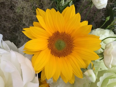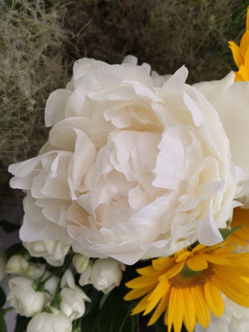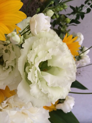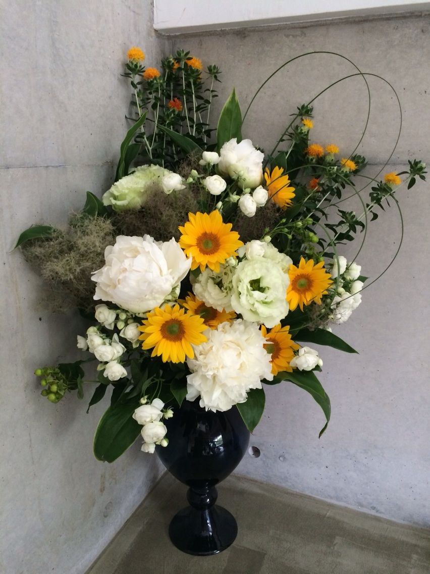 6/8〜のお花(シャクヤク、トルコキキョウ、ヒマワリ、ベニバナ、スプレーバラ、ヒペリカム、スチールグラス、スモークツリー)梅雨どきはビタミンカラーのお花で部屋を明るく!