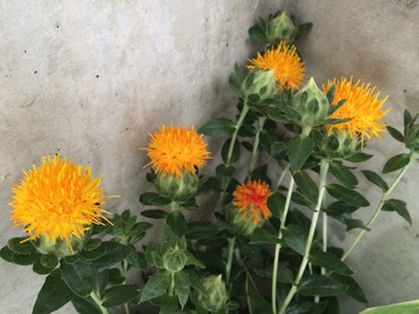 ベニバナ。紅花油(サフラワー油)でおなじみですが、花をアレンジに使ったのは初めて!