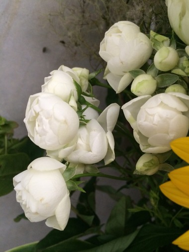 スプレーバラ(白)。スプレーバラは一輪に何個も花がついているので、オトク感があります