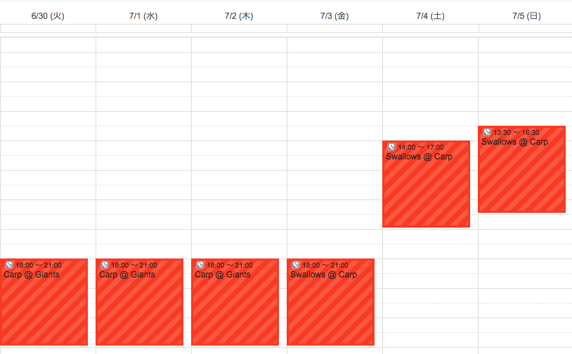 …仕事場PC・自宅PC・iPhone・iPadと、Googleカレンダーをチェックできるデバイスがあれば、いつでもどこでも確認できます。デーゲームかナイトゲームかも、視覚的にぱっとわかるのもありがたいです。