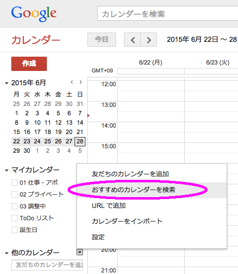 3)このようなメニューが出てきますので、その中から「おすすめのカレンダーを検索」をクリック。