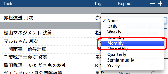 ¤ Repeat°À¤Ë¤Ï¡¢Daily¡ÊÆü¤´¤È¡Ë¡¢Weekly¡Ê½µ¤´¤È¡Ë¡¢Biweekly¡Ê³Ö½µ¤´¤È¡Ë¡¢Monthly¡Ê·î¤´¤È¡Ë¡¢Bimonthly¡Ê³Ö·î¤´¤È¡Ë¡¢Quartely¡Ê»ÍȾ´ü¤´¤È¡Ë¡¢Semiannually¡ÊȾǯ¤´¤È¡Ë¡¢Yearly¡Êǯ¤´¤È¡Ë¤¬¤¢¤ê¤Þ¤¹¡£