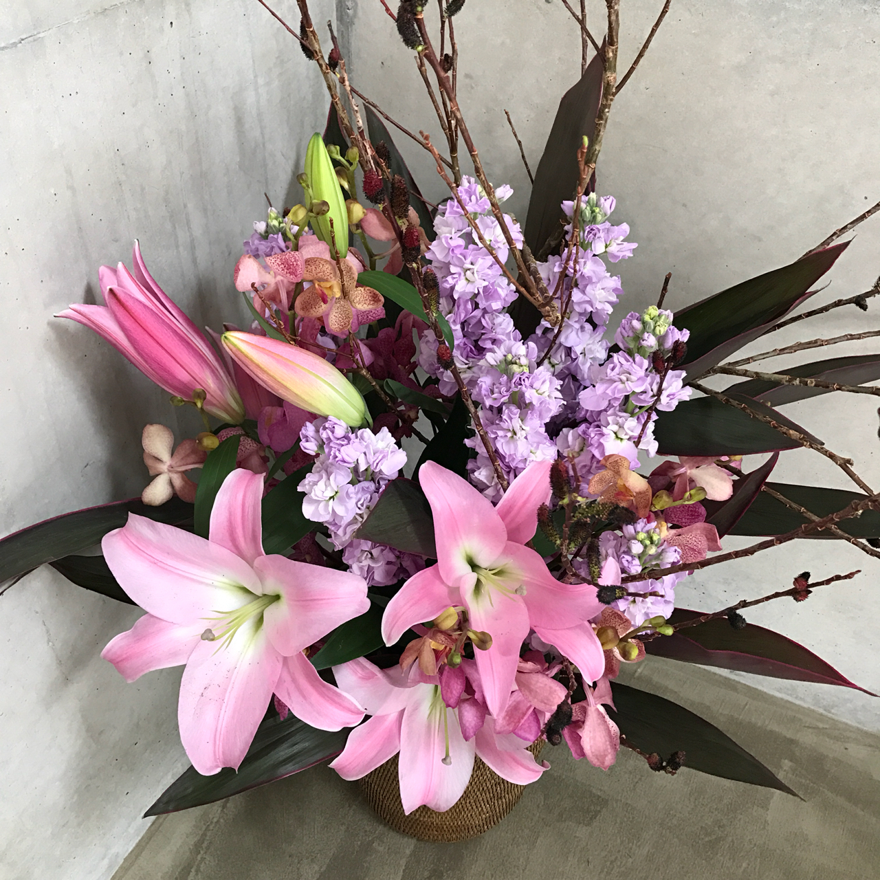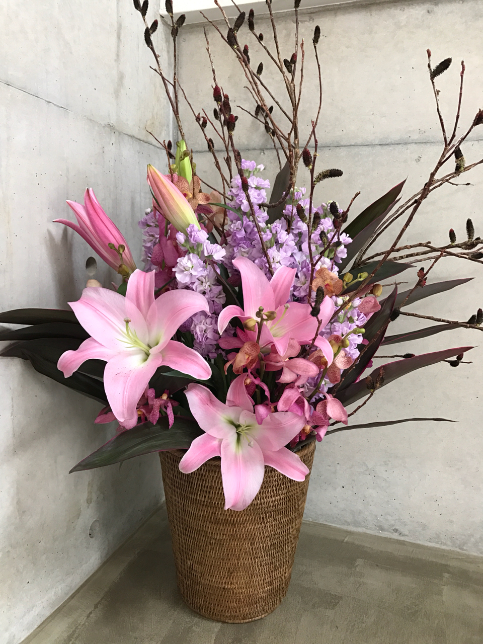 もしも、ユリ・ストック・モカラだけなら、甘々のアレンジメントになるところ、このクロメヤナギが引き締めてくれています。