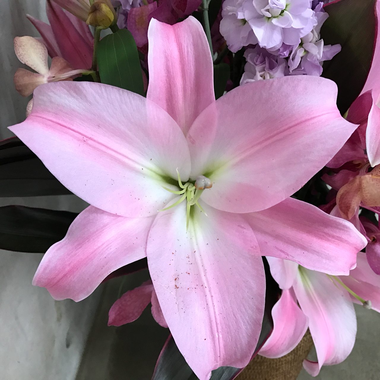 このアレンジメント、ユリとストックのおかげで、とても良い香りがします。