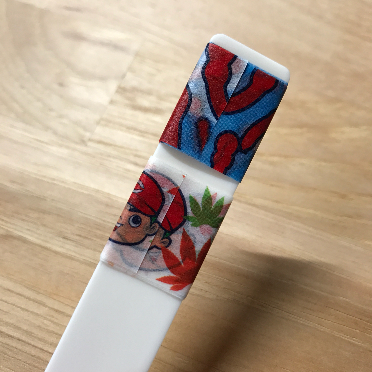 このマステ棒、持ち歩きやマステの交換用に、とてもおススメです。先にお話ししたとおり、リーズナブルというのもありますが、まっ平なのがいいんですよね。