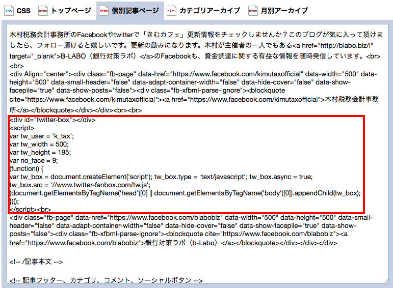 そこで、ブログの個別記事のhtmlから、Twitter Fan Boxを表示させていた記述を、そっくり削除してみました。