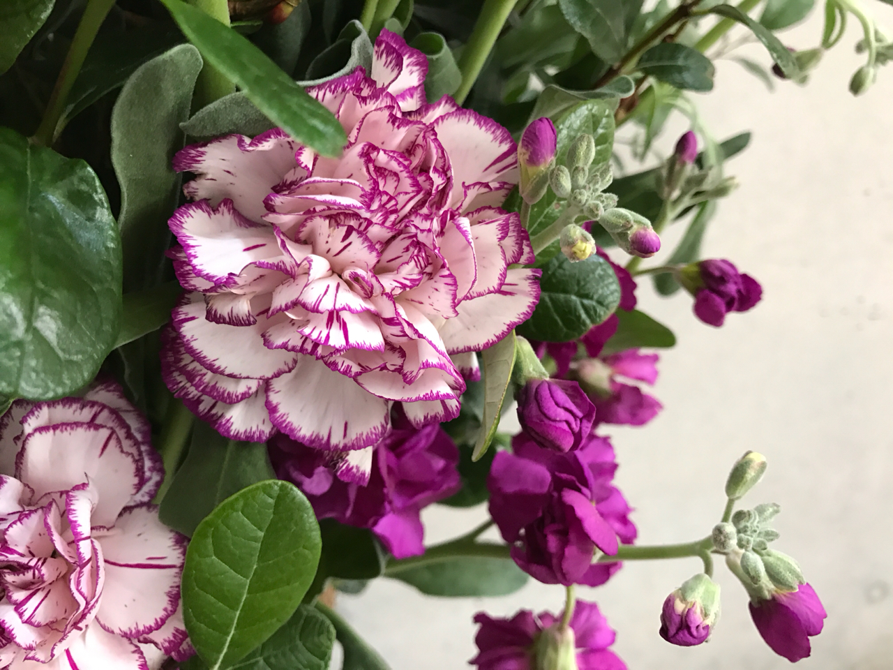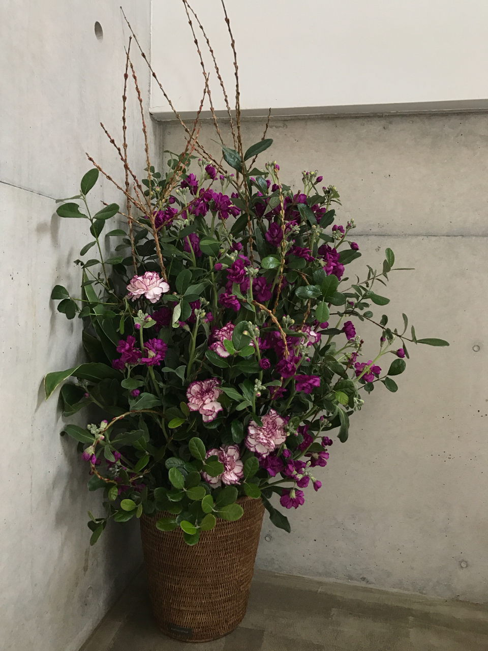 今回のアレンジは、ストックとカーネーションという華やかなお花の組み合わせですが、同系色で、しかも濃(ストック)淡(カーネーション)をつけているところがいいですね。お花を2つ組み合せる時の、良いヒントになりますね♪
