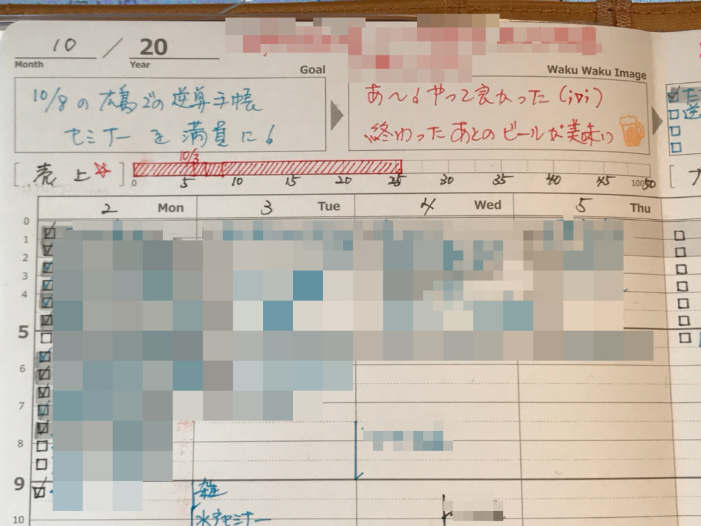 ウィークリーダイアリーに、週間売上の目標進捗バーを取り入れてみてはいかがでしょうか。とても励みになります。フリーランスは、自分のありとあらゆることをマネタイズできないか考え取り組む姿勢が必要で、その発想・行動を生みだす元にもなります。